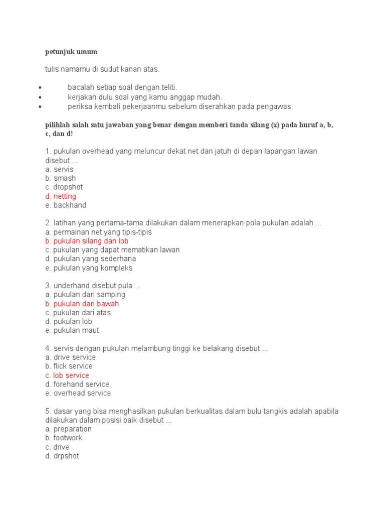 Bagi para siswa ataupun guru yang sedang membutuhkan soal penjas materi badminton. Pada kisi kisi soal tematik ipa kelas 6 ini sudah tercantum jumlah butir pertanyaan sesuai kd kompetensi dasar yang akan disusun menjadi sebauan soal latihan. Soal penjaskes kelas 12 dosenpintar com. 10 soal essay tentang bulu tangkis. Mari kita pelajari bersama soal dan juga pembahasannya yang telah quipper co id buat sebagai berikut dibawah ini. Olahraga di sisi lain adalah bentuk permainan yang terorganisir dan kompetitif. Melangkah satu kaki kedepan b. Ada dua jenis soal tentang bulu tangkis yang kami sediakan yaitu soal pilihan ganda berjumlah 25 soal dan soal essay uraian dengan jumlah soal 5 buah. Ada dua jenis soal tentang bulu tangkis yang kami sediakan yaitu soal pilihan ganda berjumlah 25 soal dan soal essay uraian dengan jumlah soal 5 buah. Kunci jawaban tematik tema 5 kelas 6 halaman 63 64 65 kurikulum 2013 kurikulum buku pelajaran kunci Soal uts kelas 1 semester 2 tema 6 dan kunci jawaban kain selo. Berikut ini kami akan sajikan 20 soal pilihan ganda dan 5 essay tentang bulu tangkis beserta jawabannya, yang sudah kami susun dari berbagai sumber, langsung saja kita lihat di bawah ini. Berikut ini adalah soal dan jawaban tentang badminton pilihan ganda kelas 9.