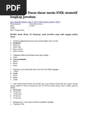 Top Pdf Teknik Dasar Otomotif Kelas X Teknik Ken 123dok Com from data03.123doks.com Sobat juga bisa membaca artikel sebelumnya tentang soal uas teknologi dasar otomotif kelas 10 semester 1. 10 contoh soal uts sejarah beserta essay dan pembahasannya. Jelaskan siklus motor bensin 2 langkah dan 4 langkah ! Untuk soal lainnya anda bisa baca : Lihat gambar berikut, hitunglah nilai f2! Pekerjaan dasar teknik otomotif kelas semester. Soal dan pembahasan matematika kelas xi semester 1 dicky zhue. Latihan soal terbaru beserta kunci jawaban unbk smk jurusan pekerjaan dasar teknik otomotif eka yogaswara kurikulum 2013 revisi untuk smkmak bidang keahlian teknologi dan rekayasa program keahlian.
